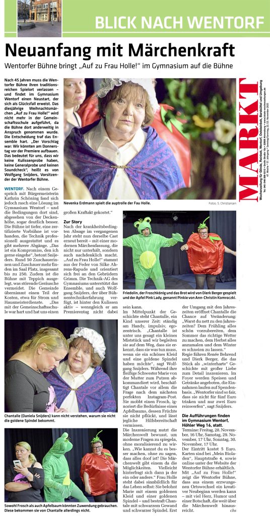 Wir bedanken uns sehr herzlich bei Sven Christiansen vom Markt für den sensationellen Artikel über unsere laufenden Proben und den Herausforderungen, die wir in den letzten Monaten zu meistern hatten! In der aktuellen Ausgabe gibt es einen großen Bericht über unsere aktuelle Inszenierung „Auf zu Frau Holle“ unter der Regie von Renée Behrend und Dierk Berger. Noch gibt es Karten, entweder direkt bei uns unter www.wentorfer-buehne.de oder im Mein Bioladen in der Hauptstrasse 4 in Wentorf. Vielen herzlichen Dank für die riesige Unterstützung.