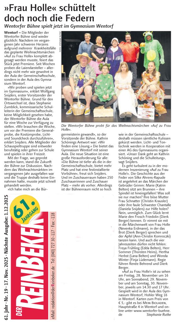 Ein riesiges Dankeschön geht an Frau Stephanie Rutke vom Reinbeker für den tollen Artikel über unsere laufenden Proben! In der aktuellen Ausgabe gibt es einen Bericht über unseren Wechsel ins Gymnasium sowie zur aktuellen Inszenierung „Auf zu Frau Holle“ unter der Regie von Renée Behrend und Dierk Berger. Unsere Weihnachtsgeschichte feiert am ersten Adventswochenende Premiere, Freitag den 28.11.2025, um 16:00 Uhr, geht es los. Karten gibt es wie immer bei Claudia Schacht und ihrem Team im Mein Bioladen in der Hauptstrasse 4 in Wentorf. Vielen herzlichen Dank für die großartige Unterstützung.